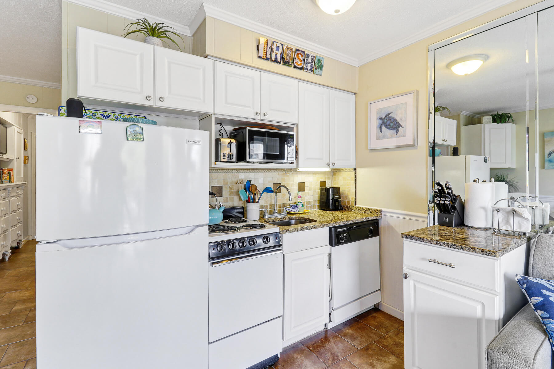 Remodeled in 2025, this cozy 518 square foot ocean view condo offers the perfect beachfront getaway just 248 steps from the beach. This charming, resort-style villa blends coastal elegance with modern comfort. Inside, you will find find stylish tile flooring throughout and an inviting, well-appointed kitchen featuring sleek white cabinetry, appliances, coffee pot, oven, toaster, air fryer, blender and crockpot. The peaceful bedroom offers a plush king-size bed with a new mattress for restful nights. The living room provides a queen-size sofa sleeper, armchair, dining table and chairs. There are Smart TVs in the bedroom and living room with a full range of cable and local channels. Enjoy breakfast or happy hour watching the waves crash in from high-top chairs on the balcony. Beach chairs and umbrella, sand toys,boogie board and an insulated soft cooler bag are provided for your days on the beach.Two bikes and a bike lock are also included.